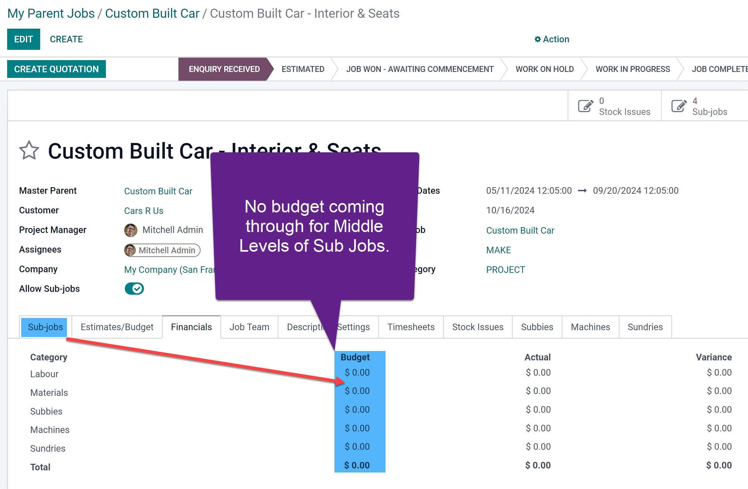 The Estimates were entered in the lowest level (Sub-Sub Jobs), and when the Quotation was converted to Budget, the middle level(s) didn't show the budget value in the Financial Summary (I assume the same issue with Actuals)