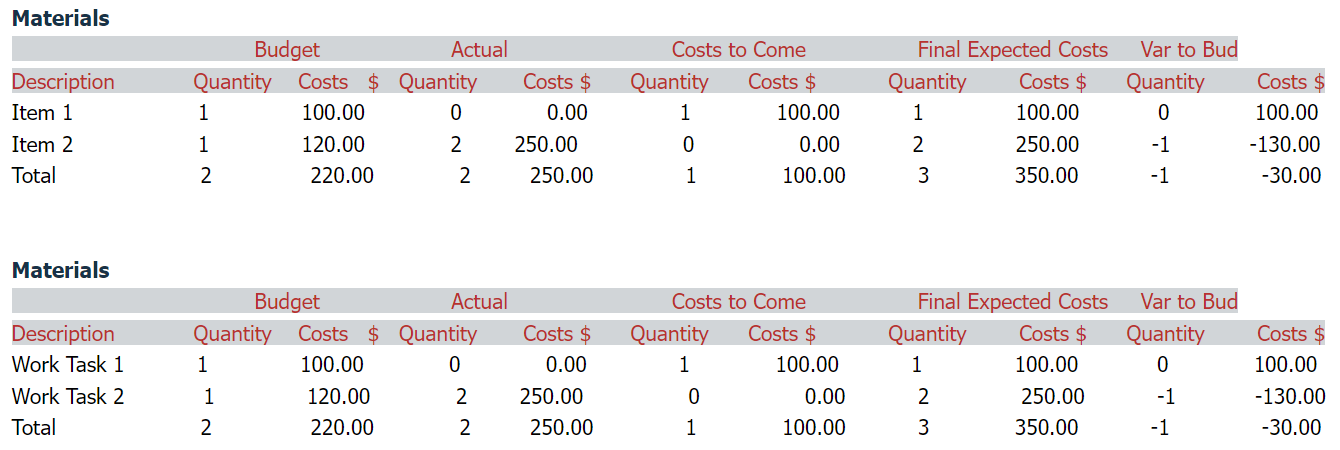 Cost to Complete report, it similar to the Budget/Actual/Variance Report.. but the main difference is you will set a expected cost to come to calculate what the ending costs will be.