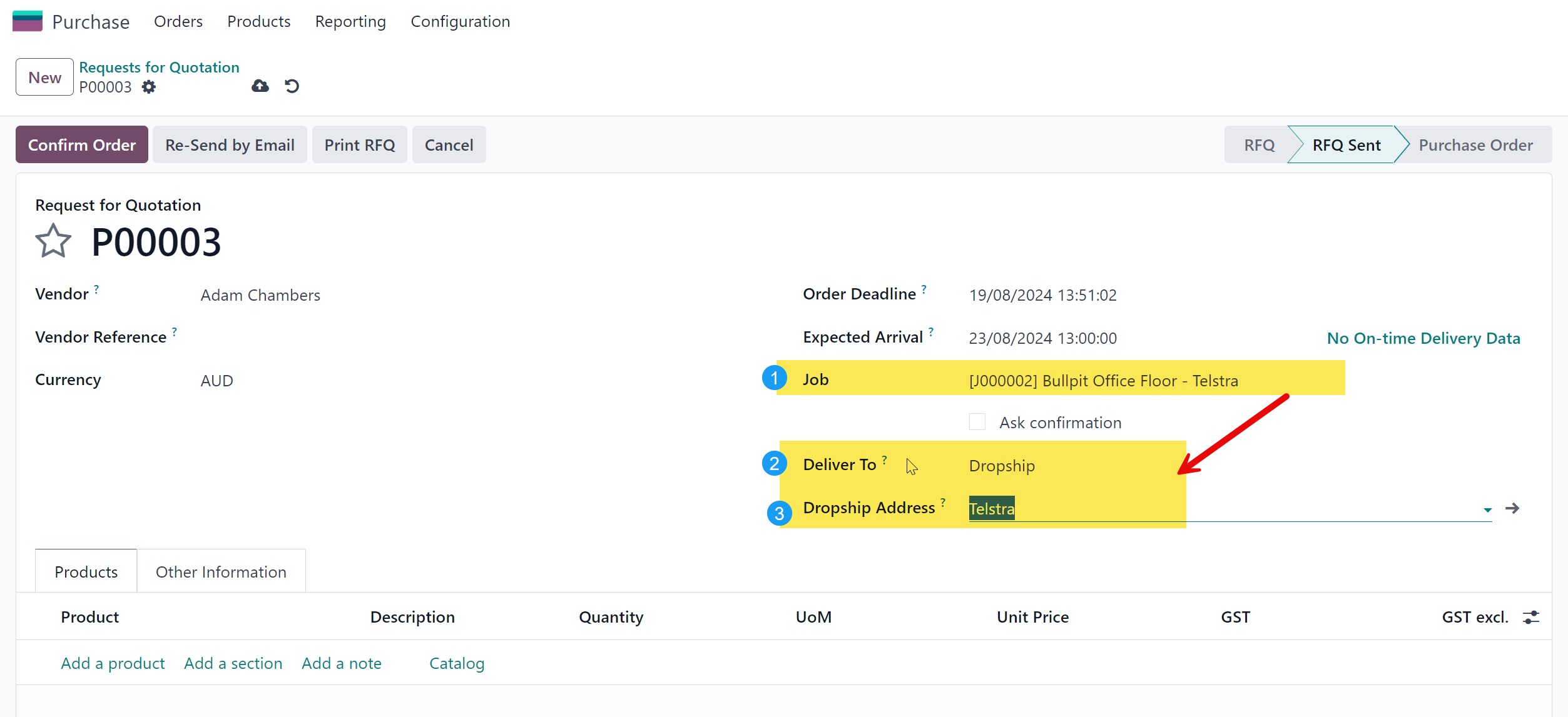 If there is a Job, and the Dropship option is selected, can this bring down the site address to the deliver to?