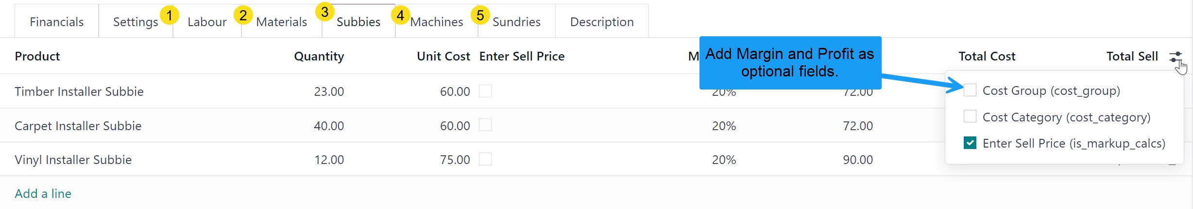Add the fields for Profit $ and Margin % to the Cost Item Lines as optional fields for all Estimate Cost Item Types.