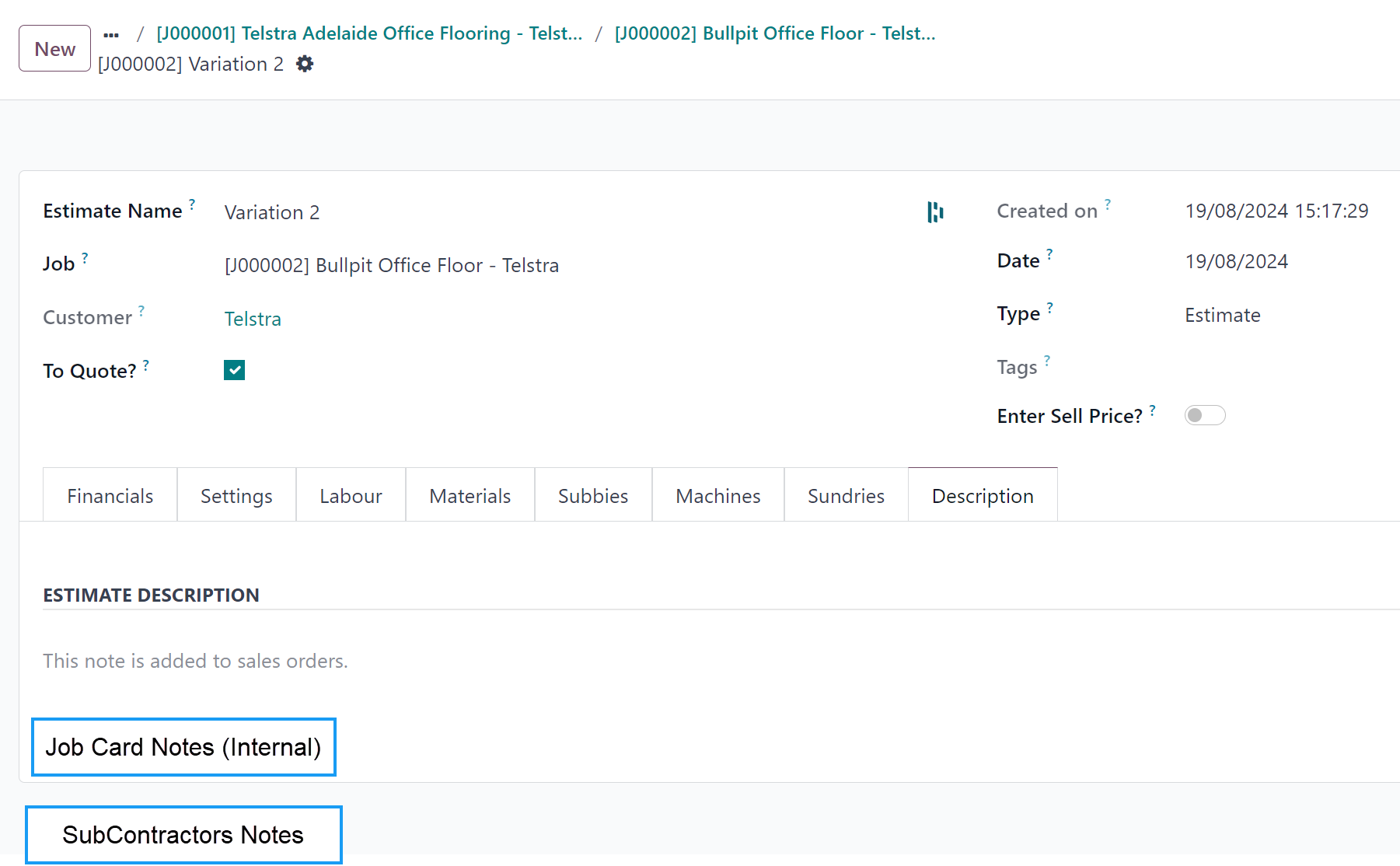Under the Estimate, there is a Text Box for notes which will attach to the Quote (Customer), but it would be good to have 2 more boxes.