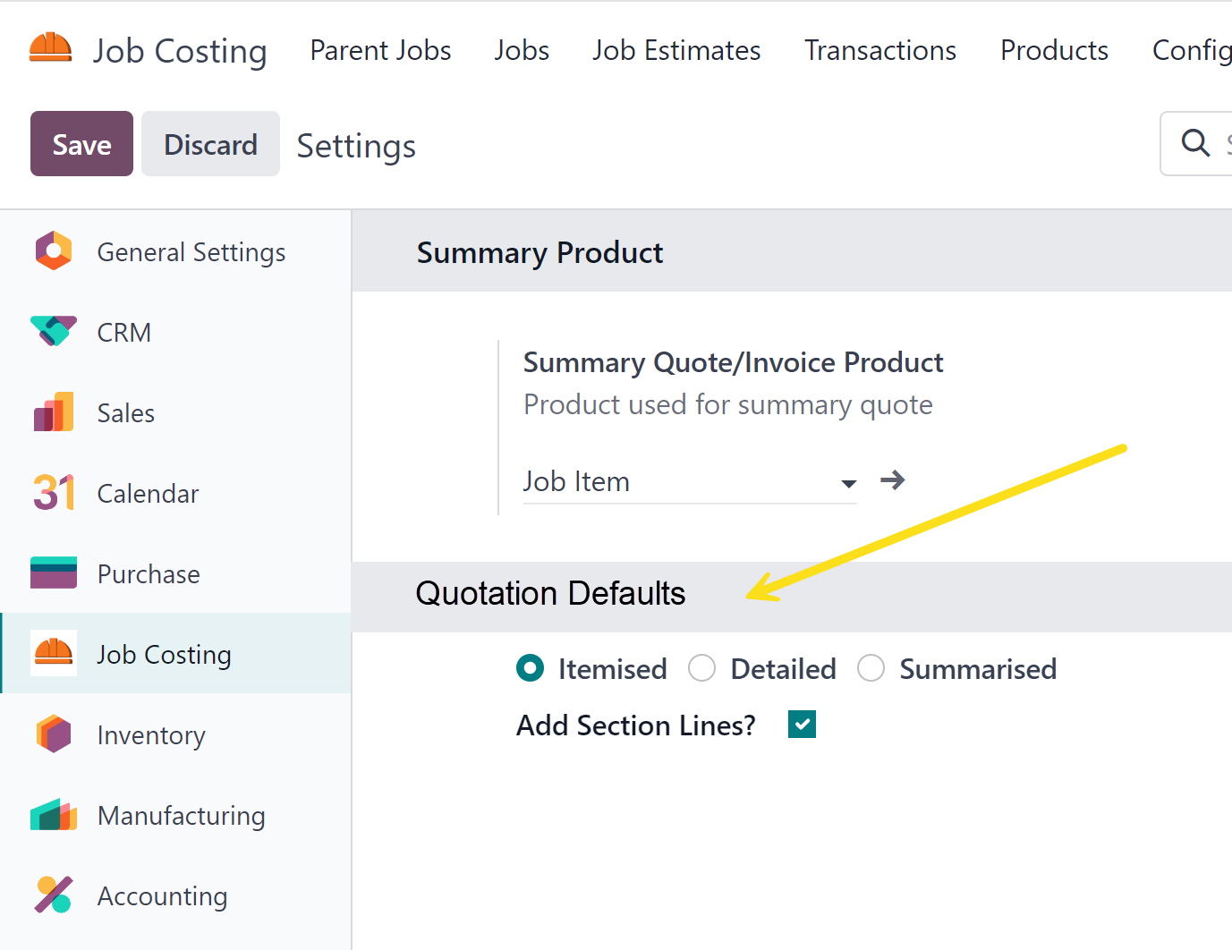Configuration Screen to set the Default Quotation Type & Section Heading